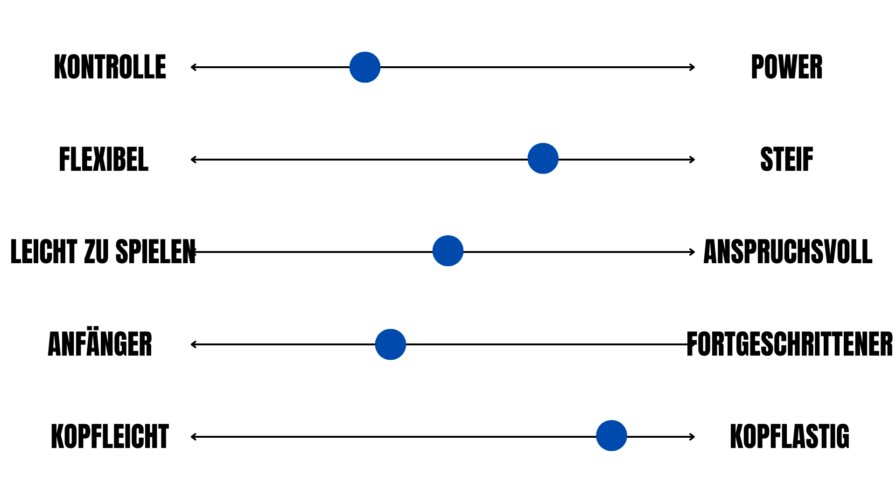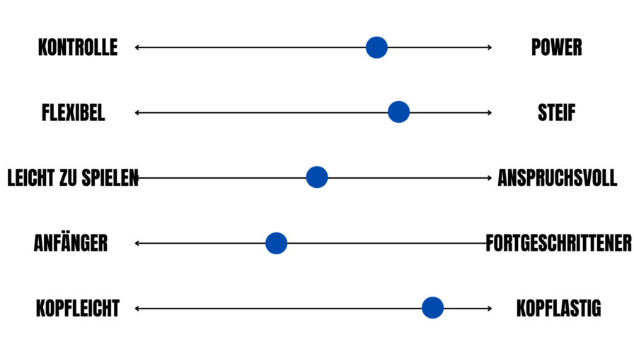 Anfänger vs. Fortgeschritten: Zeigt, für welchen Spielertyp der Schläger gedacht ist. Je anspruchsvoller der Schläger, desto weiter wandert der Punkt in Richtung „Fortgeschritten“.